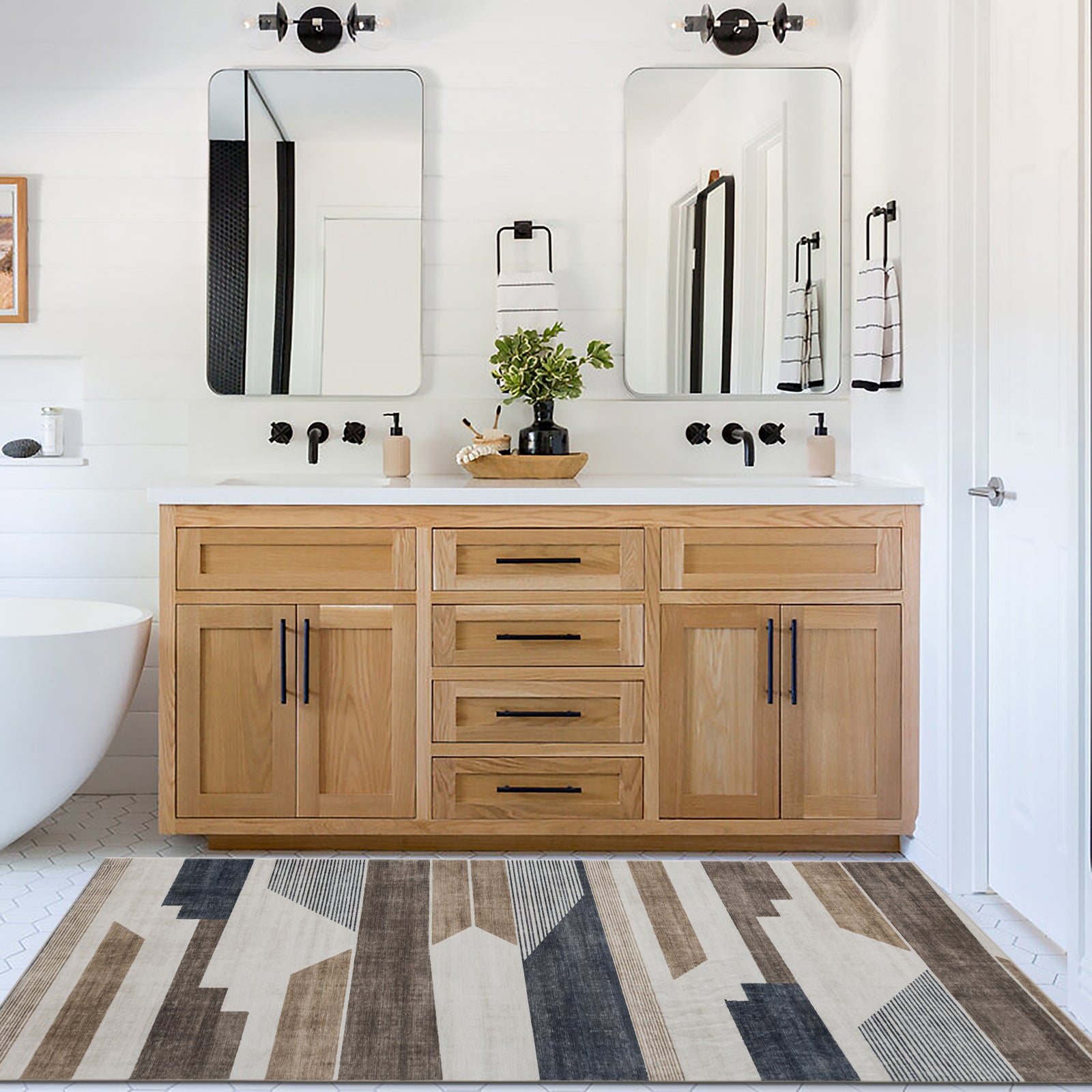 The Theo  Modern – Beige  ReaLife Machine Washable Rug blends crisp geometric lines with tribal‑inspired motifs, creating a striking yet versatile foundation for your décor. Bold black graphics traverse a warm‑beige field, pairing dramatic contrast with soothing natural tones. This piece complements minimalist, Scandinavian, boho, or eclectic interiors whether anchoring a living room, greeting guests in an entryway, defining a hallway path, or adding a graphic edge to a modern kitchen or bedroom retreat. Designed for real life, its machine‑washable construction makes it effortless to maintain stylish, durable comfort for family and pet‑friendly spaces.