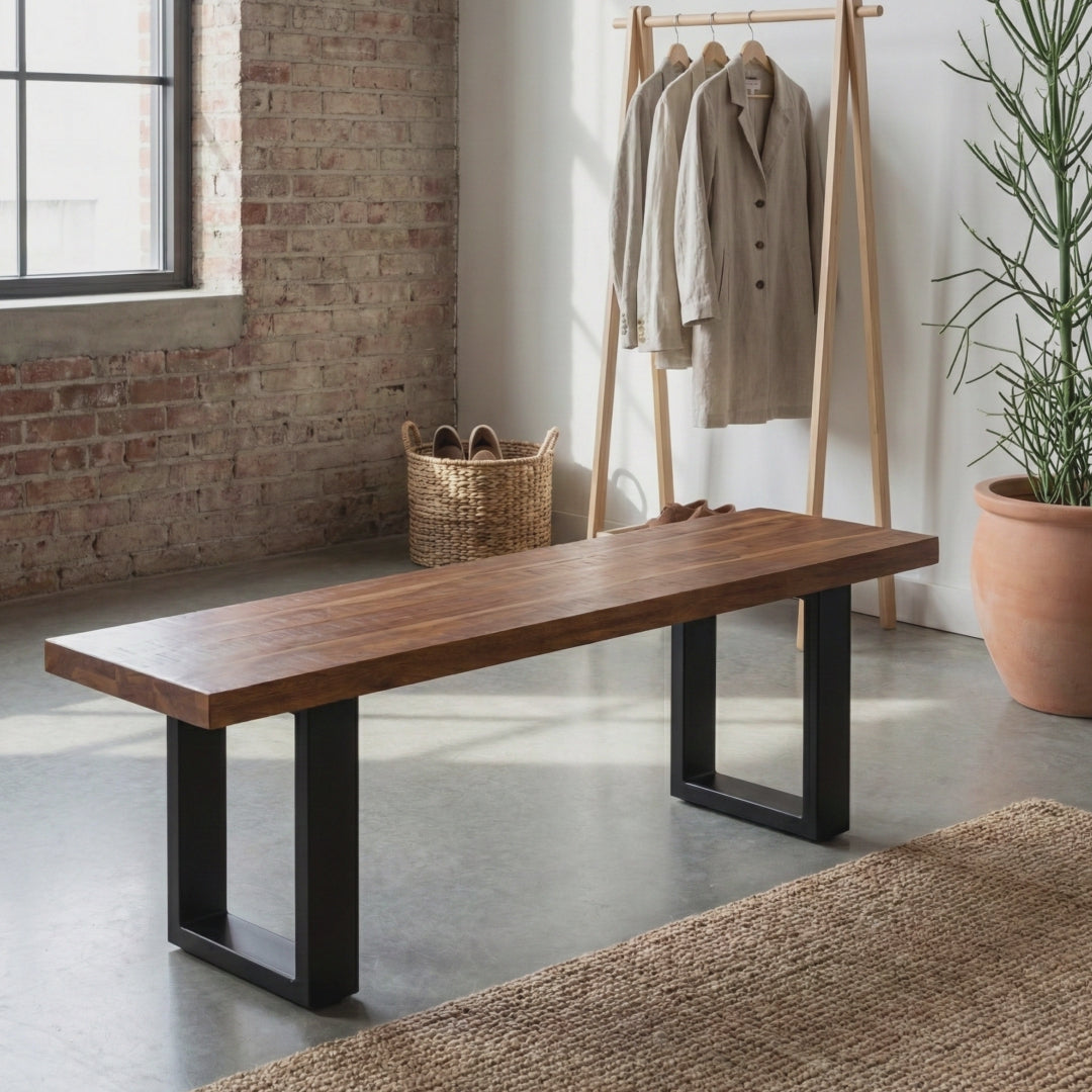 The Aurora solid mango wood bench, handcrafted in India, is a versatile addition to any space. Made from durable iron and rustic mango wood, this multifunctional piece enhances your hallway or foyer, provides extra seating at the table, or acts as a modern accent in your bedroom.