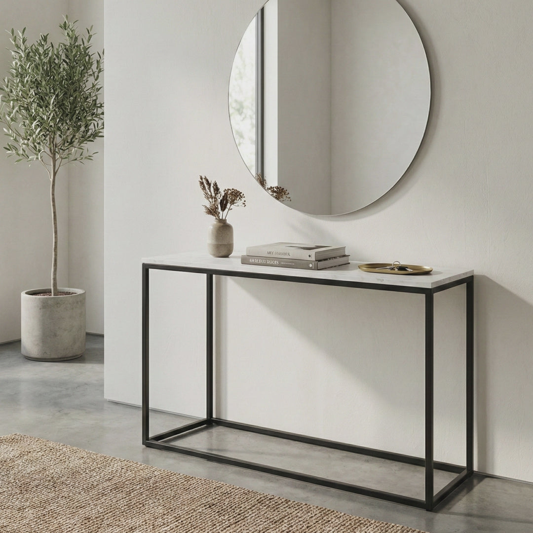 47" x 14" x 29" - Console table features a marble top for strength and style. Metal base is constructed from superior powder coated iron for outstanding durability and support to last