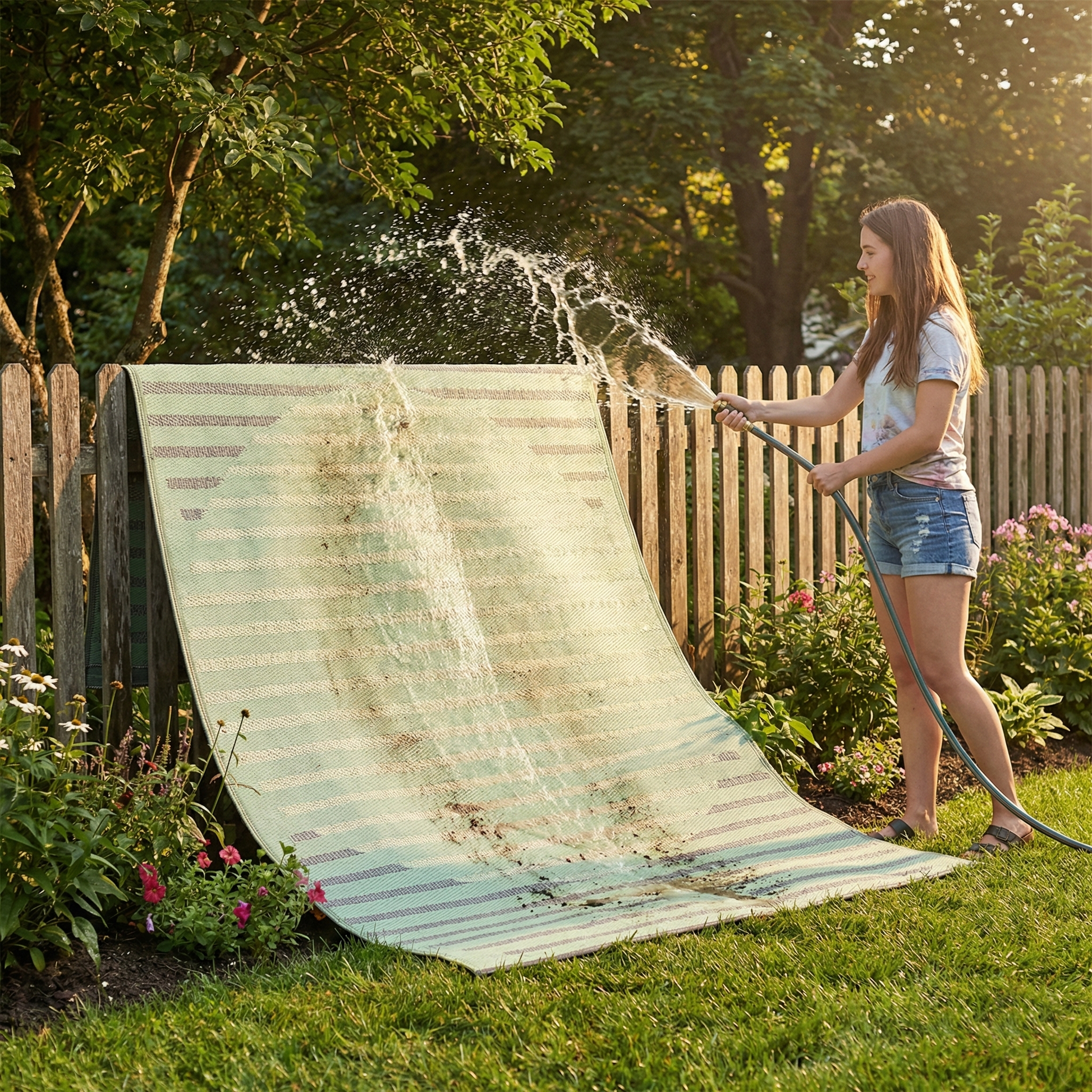 - Durable enough to withstand rain, sun, and other outdoor elements, these rugs can be easily swept or hosed off for quick cleaning.